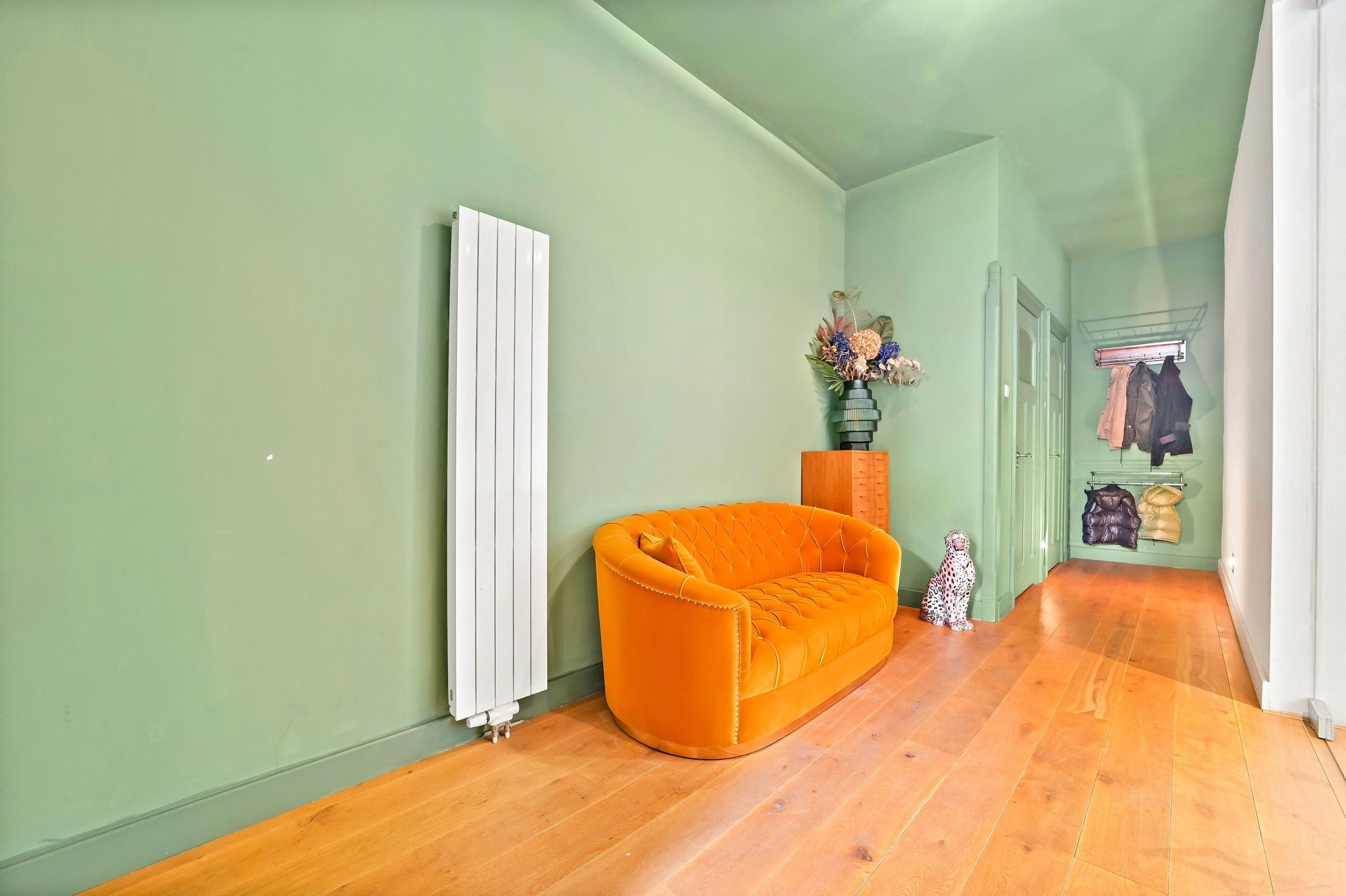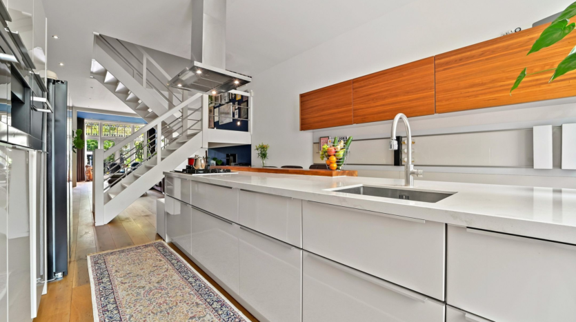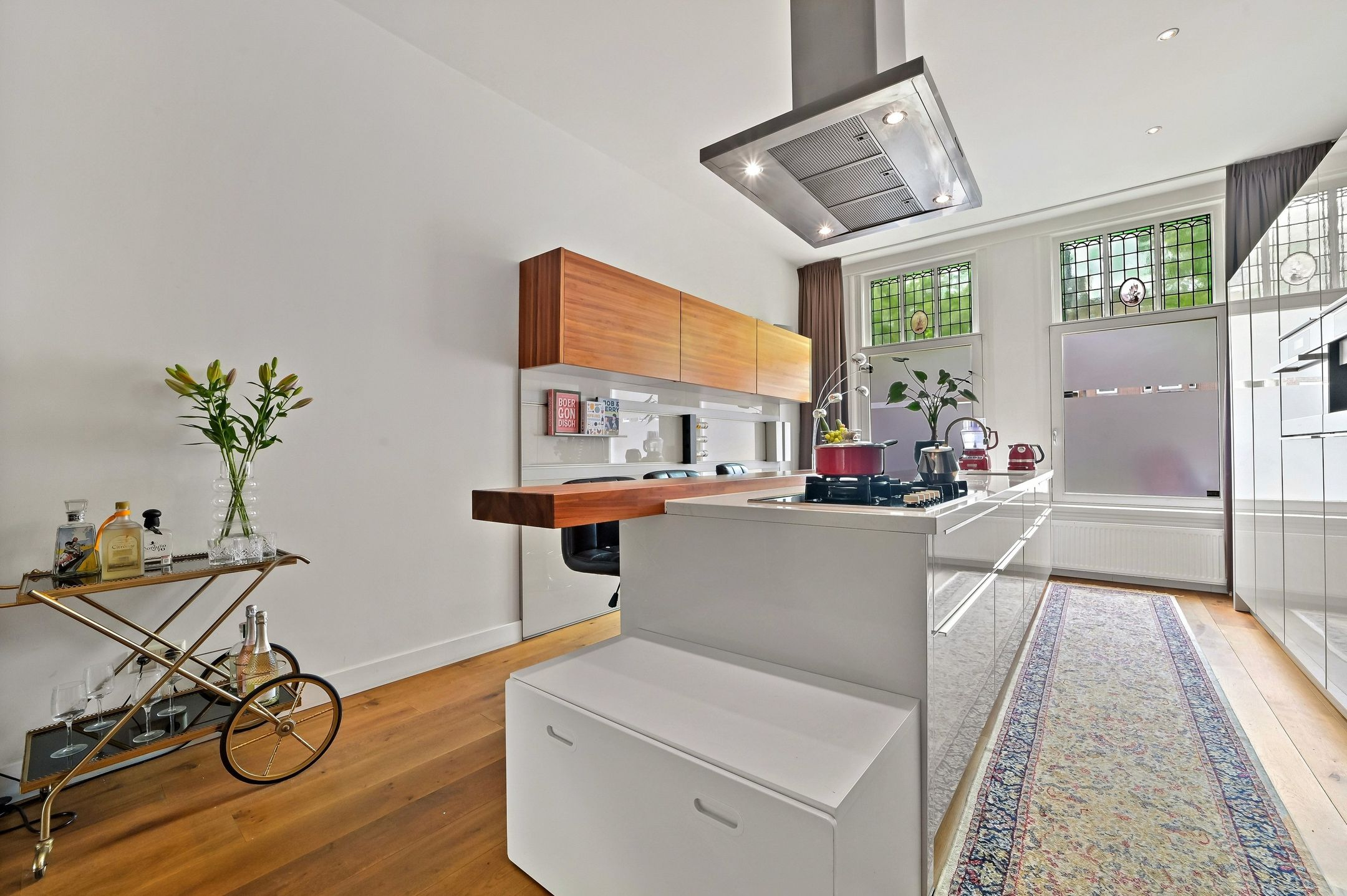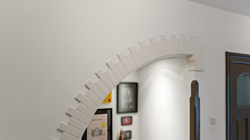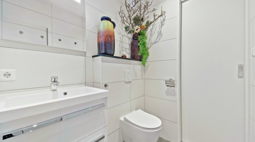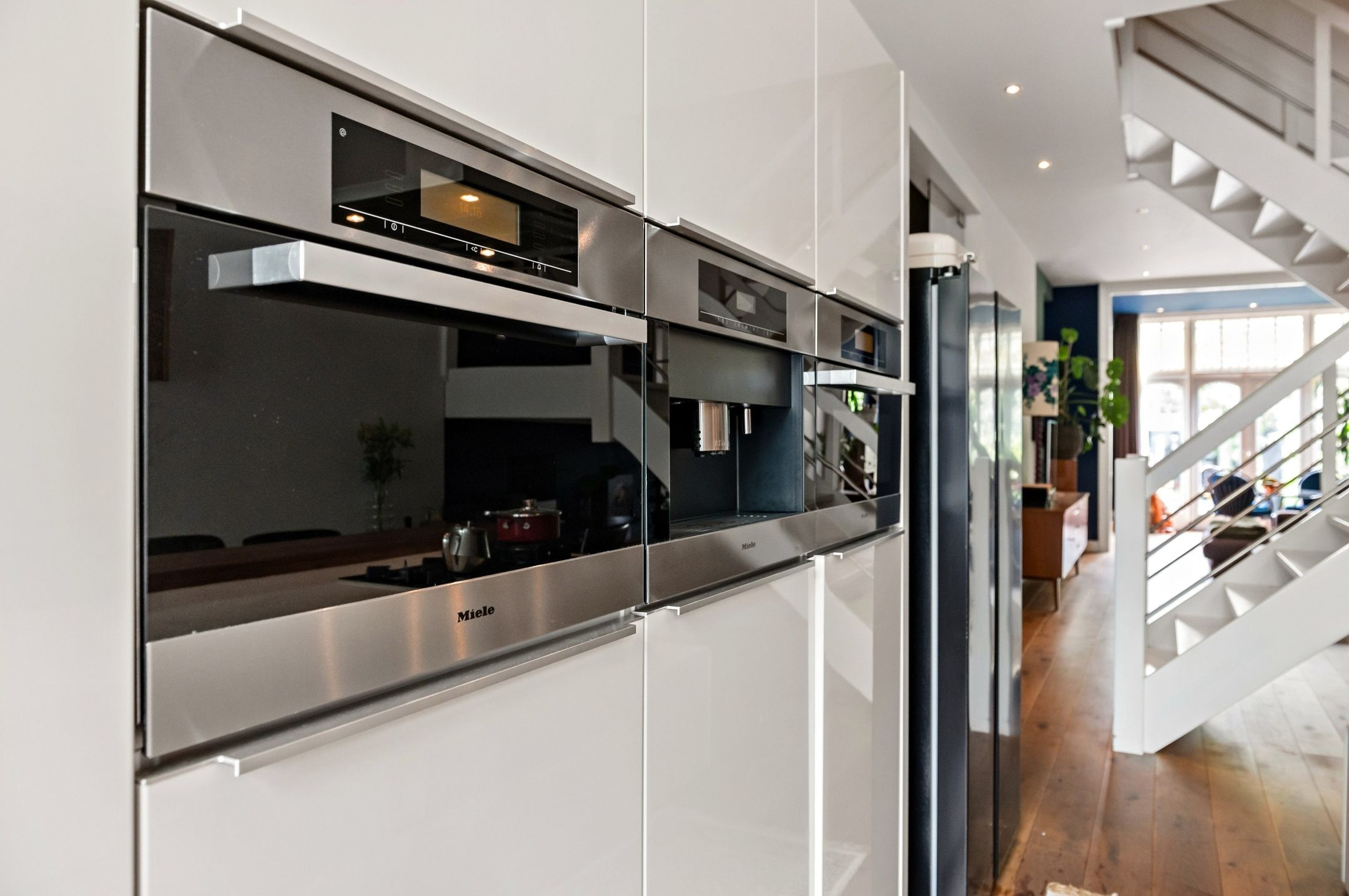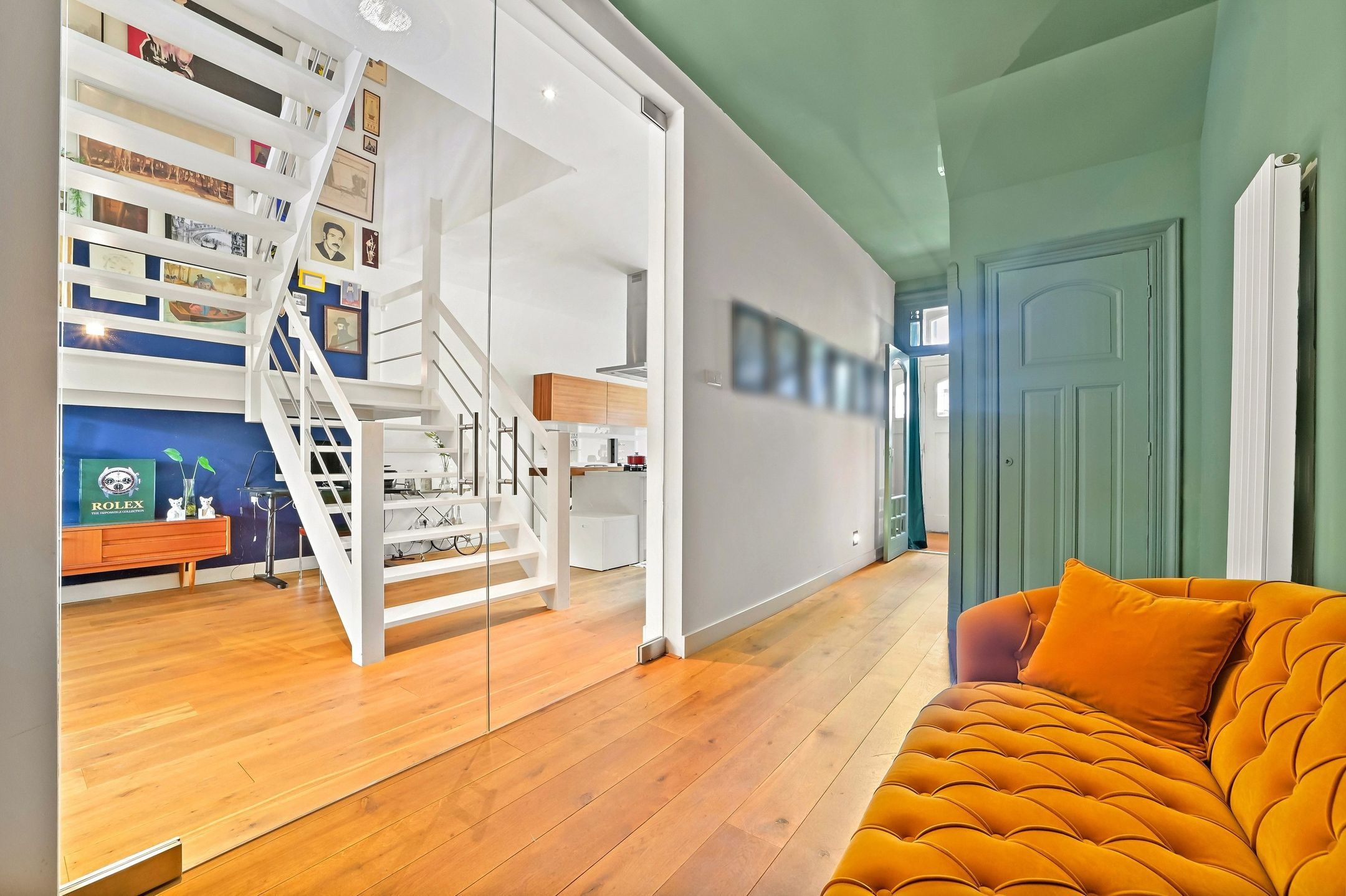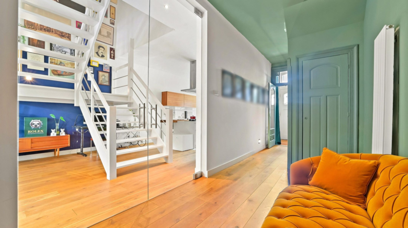 The main residence was completely renovated in 2014 and thoughtfully redesigned under architectural guidance. One of the standout features is the grand staircase positioned at the heart of the 16-meter-deep living space, replacing the traditional hallway stairs. This bold architectural choice created an impressively wide hallway with double pivot doors reaching three meters high. Additional highlights include a stunning open-plan kitchen with a central island and premium Miele appliances, as well as a luxurious 10 m² bathroom.