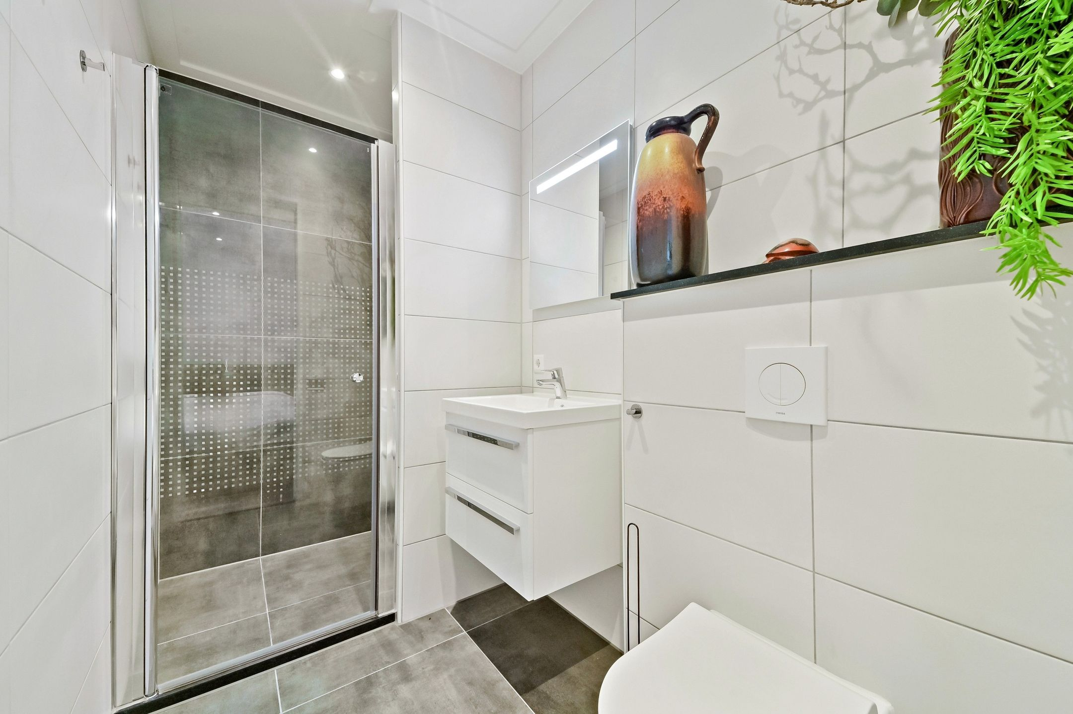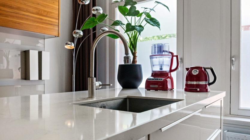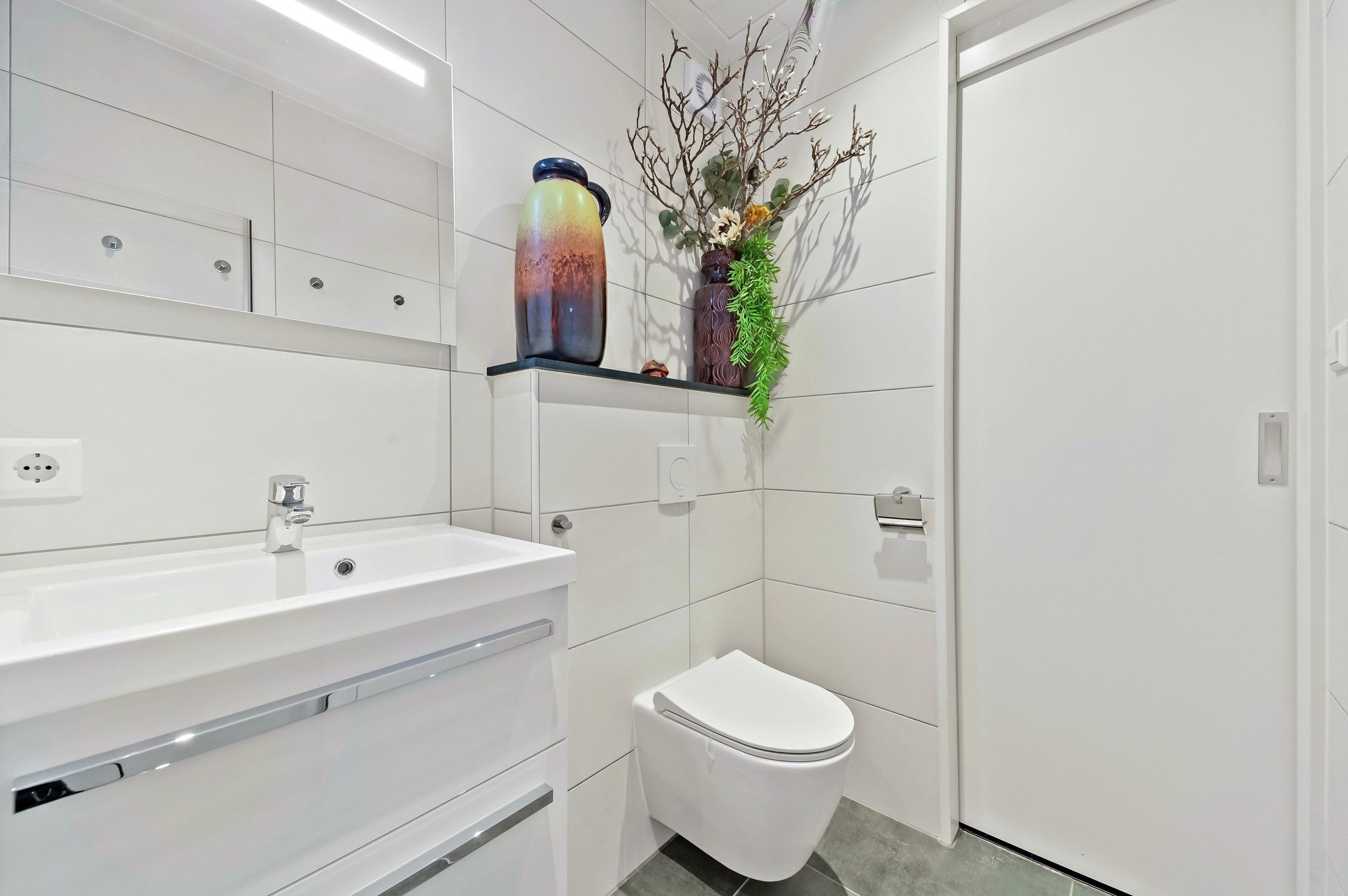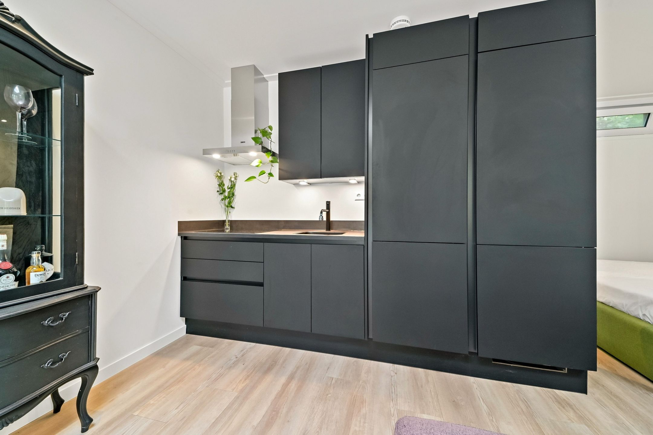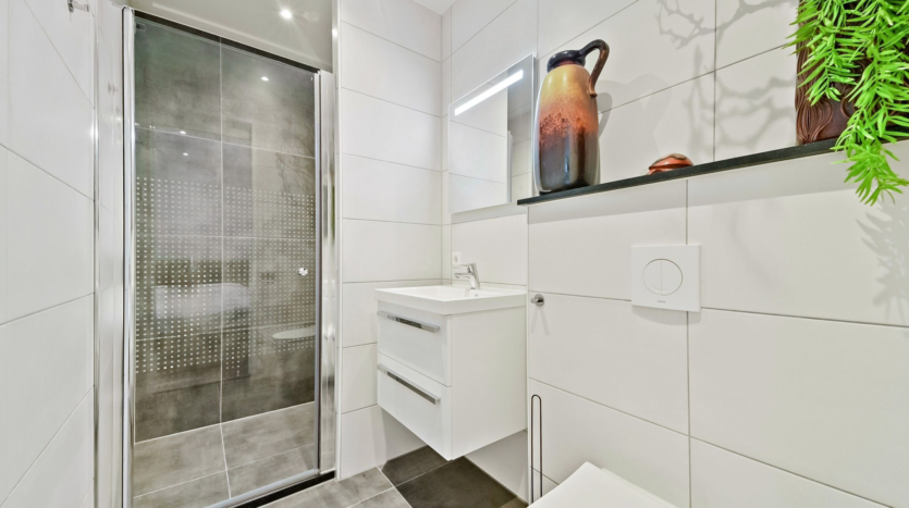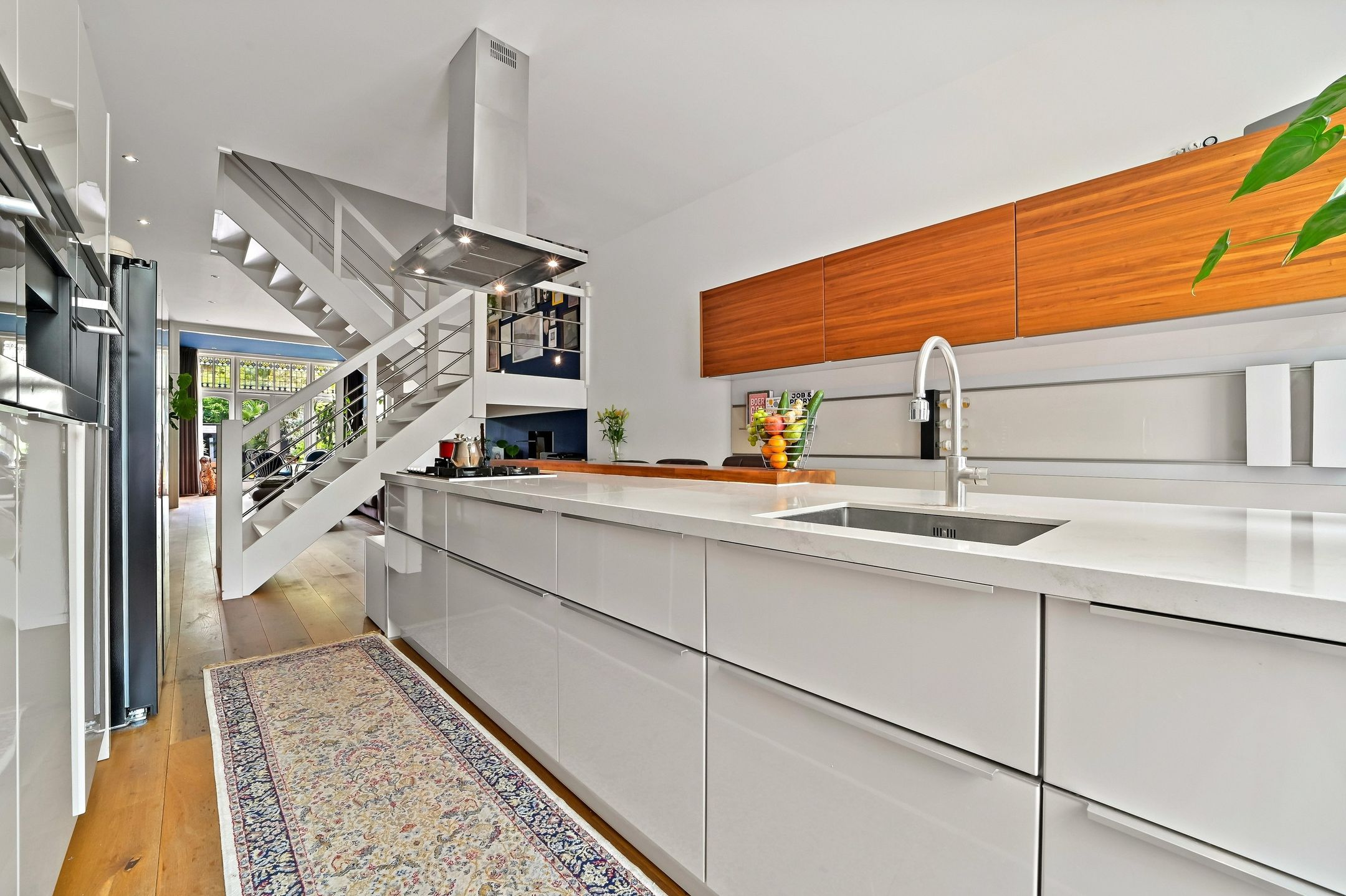 The main residence was completely renovated in 2014 and thoughtfully redesigned under architectural guidance. One of the standout features is the grand staircase positioned at the heart of the 16-meter-deep living space, replacing the traditional hallway stairs. This bold architectural choice created an impressively wide hallway with double pivot doors reaching three meters high. Additional highlights include a stunning open-plan kitchen with a central island and premium Miele appliances, as well as a luxurious 10 m² bathroom.